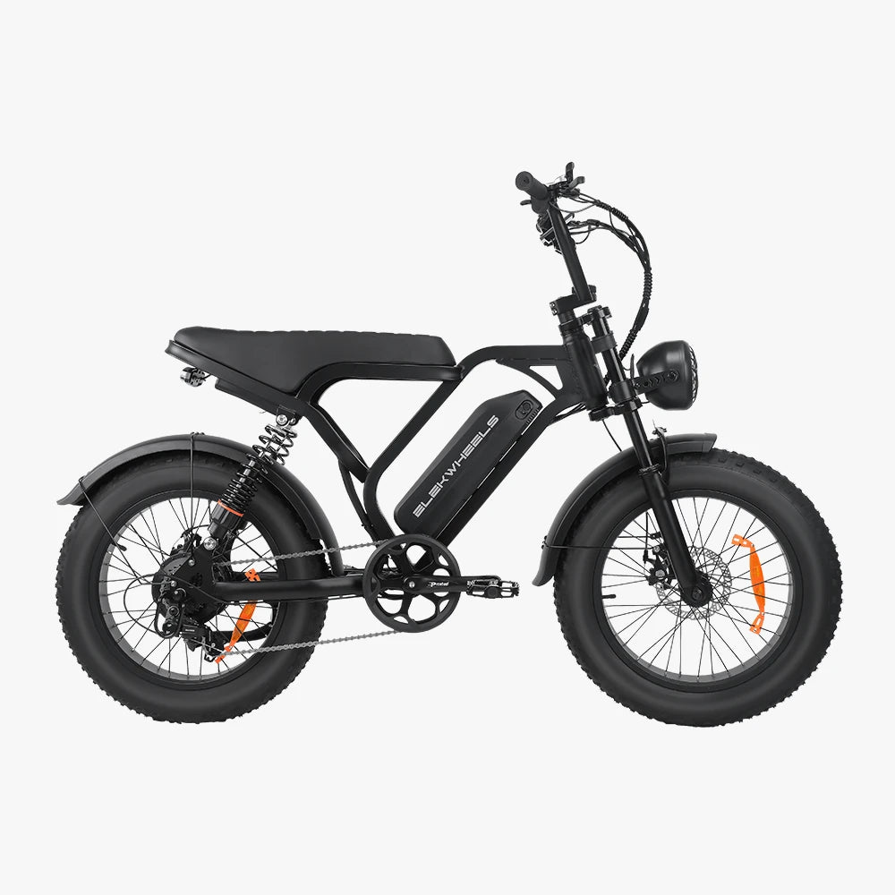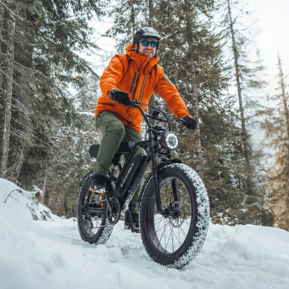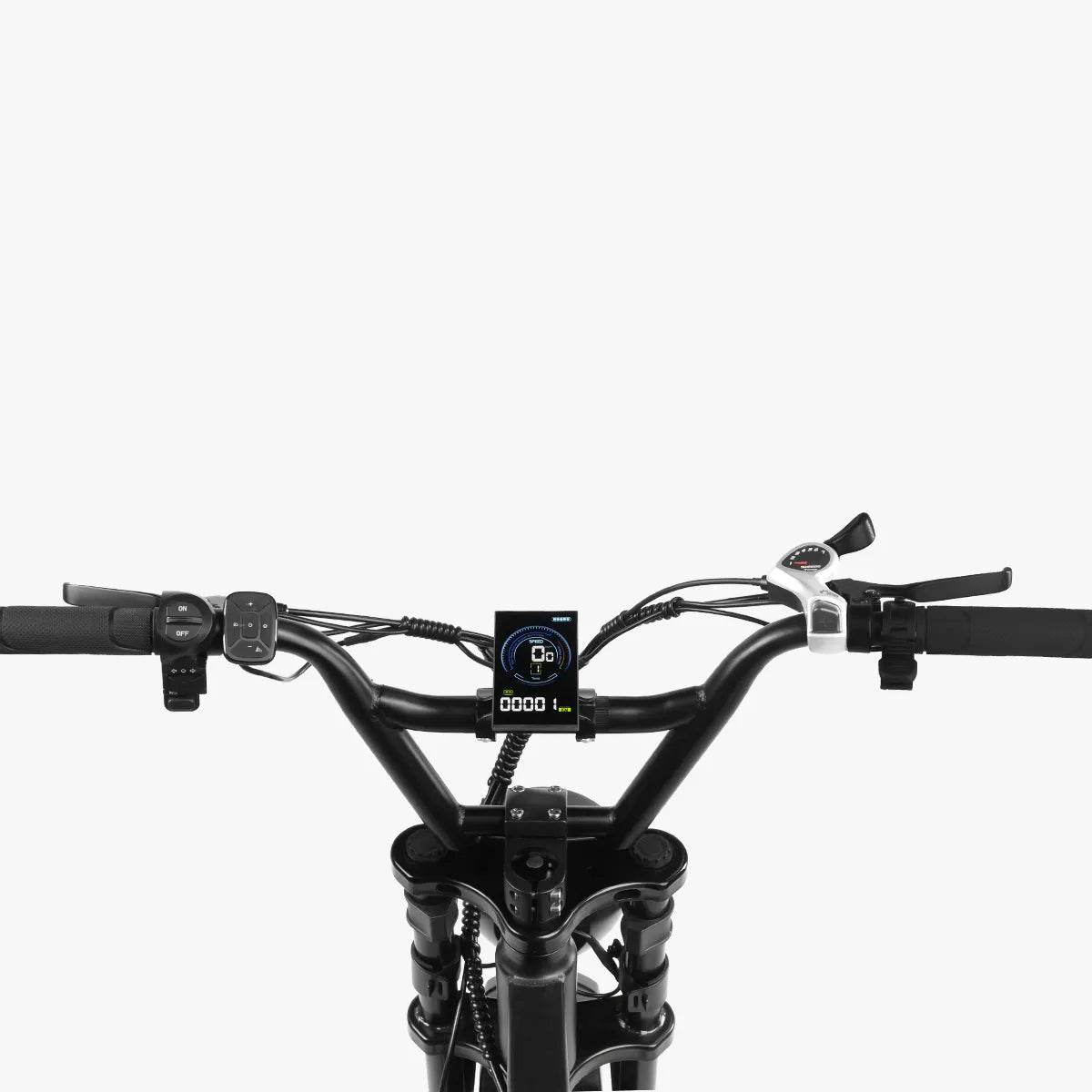 A bold, moped-style fat e-bike with dual rear suspension, perfect for smooth rides on city streets and rugged trails.
